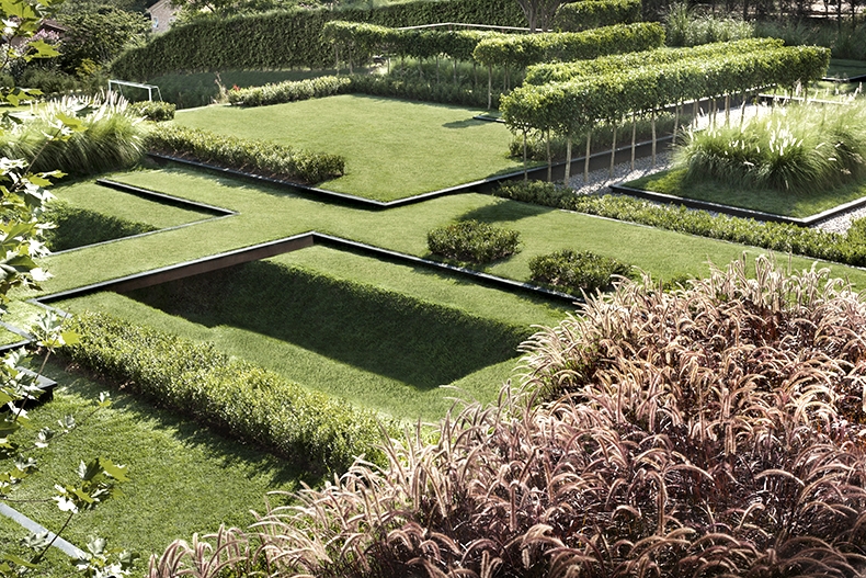 He prizes the sense of calm established by geometry. His more recent compositions include the 300m-long cherry walk, neither avenue nor grid, that forms part of his masterplan for a new entrance to Wisley; and perhaps the most intriguing, an extension to his earlier garden for a house on the fringes of London. Here new and sometimes oblique angles in the form of paths, sitting areas, and water are seemingly carved out of a vast beech hedge creating a new vocabulary of shapes.