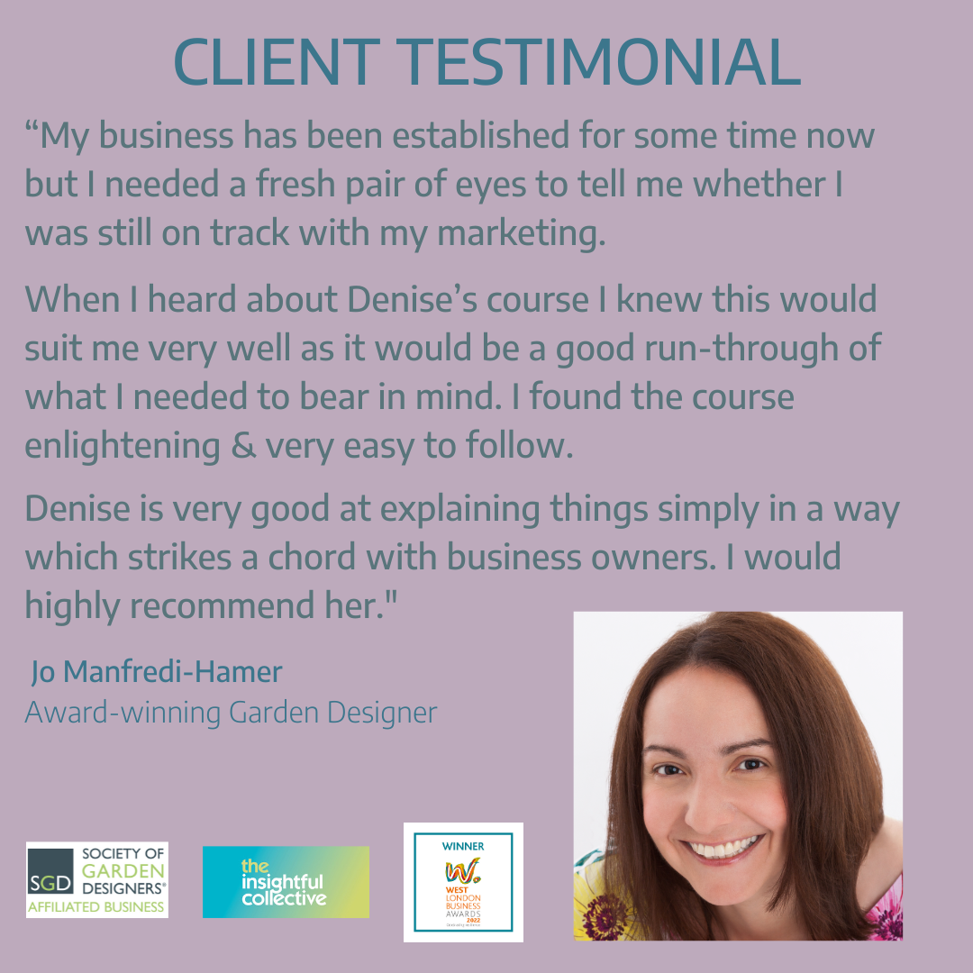 Specialising with garden designers and horticulturalists, Denise has coached hundreds of both newer and more established business owners through her tailored: