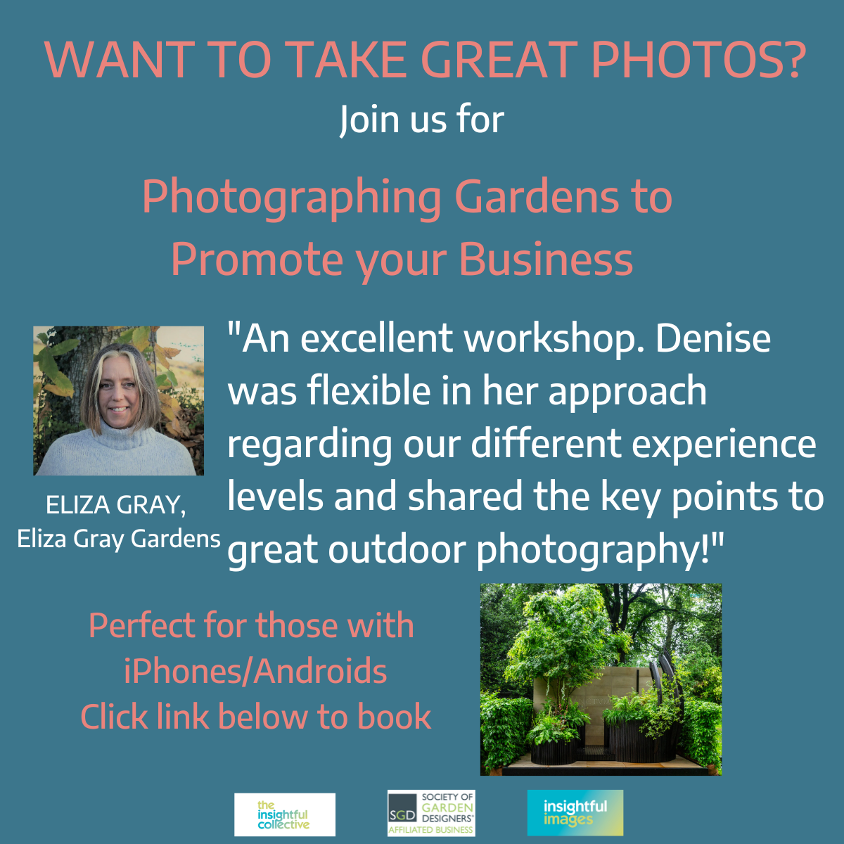 What works well to get the best photographic results to promote you and your garden design business, whether using a camera phone, ‘point & shoot’, mirrorless or DSLR camera